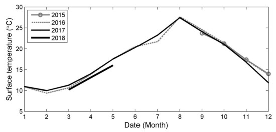 Monthly annual variations of the averaged surface water temperature retrieved by the Korea Ocean Observing and Forecasting System of the Korea Hydrographic and Oceanographic Agency in Jinhae Bay from 2015 to 2018.