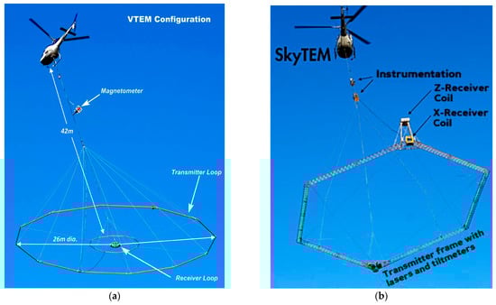 GeoTech VTEM (a) and SkyTEM geophysical surveys (b)—examples of modern systems for airborne electromagnetic sounding.