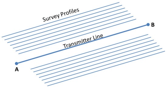 This task needs a large operating radius. Therefore, a line-to-loop survey was implemented, where the power source is a long line, since such a current source provides an acceptable operating radius, but the measuring system is an induction loop, since such a sensor can measure without contact with the ground. This measurement geometry is atypical, since usually the transmitter and receiver are of the same type—“line–line” or “loop–loop”. The power source is placed on the ground, while the measurement system is on the aircraft (Figure 2). The transmitter is a galvanically grounded power line with length up to several kilometers long. The signal is bipolar current pulses with a pause. The survey lines are parallel to transmitter line and located at a distance of 40 to 100 m from each other.