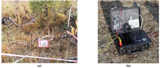 As already noted, in contrast to the classic version of ground-based or airborne TEM, the created complex uses not a loop as a current source in the geological environment, but a transmitter line, galvanically grounded at the ends. Depending on the geological task and natural conditions, its length may be different, but in typical ore tasks it is 2–4 km, which theoretically allows surveying over an area of more than 10 square kilometers. A line of such a length of geophysical power cable, coiled of 2 × 500 m, is quite easy to deliver to the work area, and it can be deployed by three of men even in the forest. For grounding, steel electrodes are used, usually 10–15 pieces for each end of the transmitter line (Figure 4a).