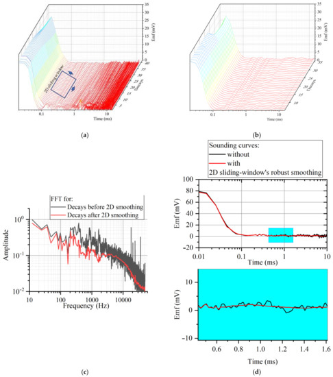 - Robust smoothing in a 2D sliding window was performed using the Hampel M-estimate, where the window length was the ADC counts in transient and the window width was neighbor transients. Several filters with different window sizes and different falloff time ranges were used for processing (Figure 6) []. After using robust smoothing in a 2D sliding window (Figure 6a,b), decays noise level was reduced (Figure 6c), because of which the sounding curve had less noise (Figure 6d).