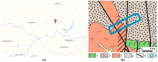 There are no exact coordinates of the area boundaries, because uranium in Russia is a strategic mineral. The features of the geological structure of the area are described in more detail in the previous publications of the authors [], in this work the geological situation at a specific area of work will be briefly described (Figure 7b).