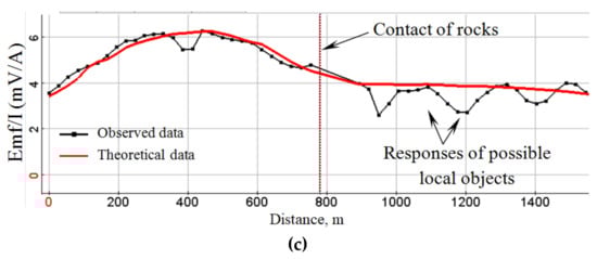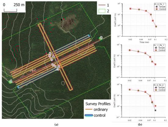 - After the completion of the row survey, a control route was taken to assess the quality of the data. Subsequently, during office processing, the convergence of the EMF curves recorded during routine and control measurements was evaluated (Figure 8b).