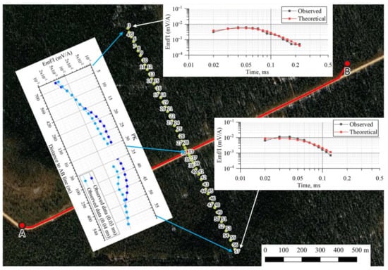 An important parameter of the effectiveness of the developed UAV-TEM technology is the maximum allowable distance to which the UAV can move away from the transmitter line, since the survey area that can be performed using one take-off point depends on this parameter. The orthogonal lines were about 600 and 800 m long. Figure 9 shows the measured sounding curves for points at their ends, as well as a graph of signal changes at time delays of 0.03 and 0.04 milliseconds. It is shown that the level of the recorded signal at the extreme points was not less than 0.005 mV/A, it was possible to invert obtained curves with sufficient accuracy. The obtained results proved that at a distance of at least half the length of the transmitter line, suitable signal was registered for processing, even in case of low current in the transmitter.