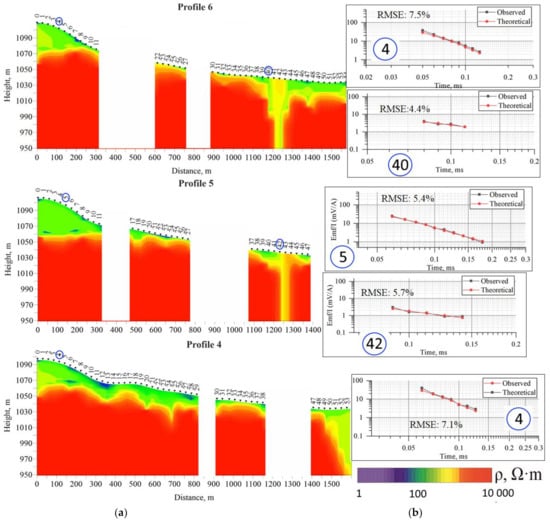 Based on the survey results, an inversion was performed in the class of 1D-models and geophysical sections were built according to the electrical resistivity parameter (Figure 10 and Figure 11). In addition to the sections and to substantiate the correctness of the solution of the inverse problem, measured and fitted curves for the characteristic sections of the section are given with an estimate of their convergence. It is important to note that the Mars1D software package does not allow one to take into account the inductive characteristic of the sensor and the shape of the current decay in the transmitter line after the pulse is off during modeling. Mars1D was developed for a line-to-line array with an emphasis on working with late times, when the effects of induced polarization, and therefore the early times were not taken into account in processing and the recorded time range was small—on average from 50 to 140 µs. Despite this, as well as the small number of points on the transient curve, suitable data for processing and inversion were obtained, and even characterized by a fairly good convergence of the observed and model curves fitted as a result of inversion (Figure 10b and Figure 11b).