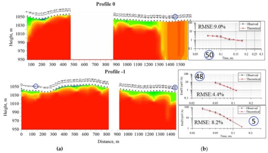 1D-inversion results of the UAV-TEM data on the survey lines No. 0 and −1 (south of the transmitter line): (a) geophysical crossections (electrical resistance); (b) convergence of ordinary and model sounding curves.