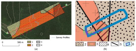 (a) Geological map corrected according to the results of the UAV-TEM: 1—metasedimentary deposits, 2—granites, 3,4—zones of faults; (b) original geological map: 2—metasedimentary deposits, 3—granites, 5—faults.