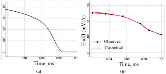 Third, to clarify the early times of transient after cut off the current in the transmitter line, it is necessary to reliably separate the effects of the current pulse after cut off and the response of the medium. The current cut-off signal in the transmitter line must be measured instrumentally to be taken into account, but not simulated analytically, as is done in this work (Section 6, Figure 13). After subtracting the effects of the current turn-off signal and the impulse response of the receiving sensor from the early times of the transient, the transient data will describe the geological environment. This will allow modeling the first meters of the geological section, and will also improve the quality of the inversion in general.