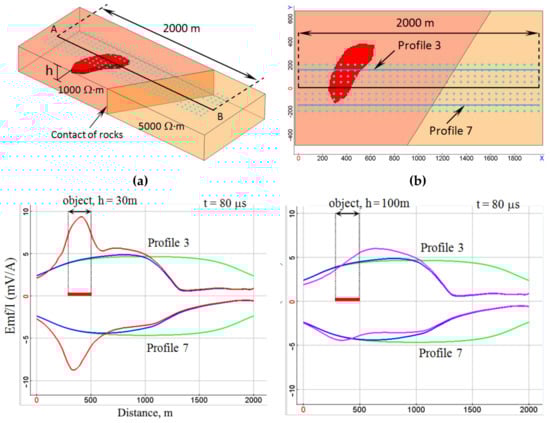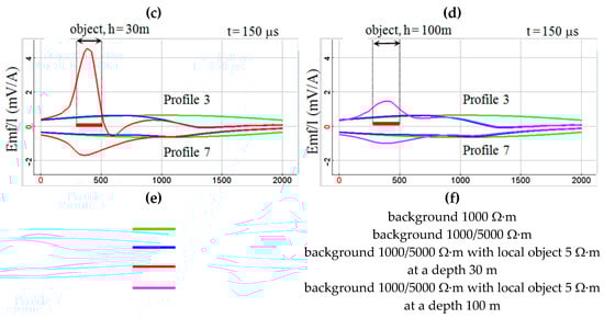 After that, 3D modeling was carried out in order to study the resolution of the measuring system, taking into account the characteristics obtained in practice. A three-dimensional model of the geological environment was created, which is a contact of rocks with different resistance (1000 Ω·m and 5000 Ω·m), and containing a local conducting object with a resistance of 5 Ω·m and dimensions of about 200 × 400 × 20 m, which corresponds, for example, to a concentration of sulfide minerals (Figure 14a,b). Modeling was carried out for two depths of the object: h = 30 m and h = 100 m. The results of modeling the data obtained using the UAV-TEM technology for this geological environment are shown in Figure 14c–f in the form of graphs of changes in the measured signal at time delays of 80 μs and 150 μs along two survey lines. The survey lines were located on different sides of the transmitter line and therefore the signals along them had different signs. Survey line 3 intersected the projection of the local object, but survey line 7 did not. In Figure 14c–f bold red line on the abscissa axis shows the interval of intersection of survey line 3 with the projection of the object.