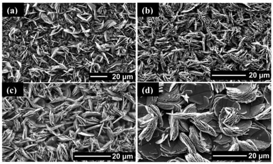 Thin films consisting of SnS nanosheets have been synthesised by Jing et al. with individual sheet thicknesses of 200–400 nm. The SnS was synthesised by the reaction of SnCl2.2H2O and thioacetamide at a pH range of 0.2–1.5, which was adjusted using sulfuric acid. The reaction was undertaken at 120–180 min at 80 °C. Sheet-like morphologies were obtained from pH 0.2–0.7 with film thicknesses of 4.37 µm, 4.03 µm, and 2.14 µm for pH 0.2, 0.4, and 0.7, respectively. Thinner films are produced at higher pH due to the precipitation of Sn(OH)2 []. The SnS is produced by the release and reaction of Sn2+ and S2− ions, similar to the reaction undertaken by Cao et al. []. The SnS was used in the creation of an FTO/SnS/CdS/Pt photocathode.