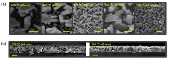 (a) Plan view scanning electron micrographs of SnS thin films grown on (100) silicon wafers at 450, 400, 375, 350, and 300 °C, respectively. (b) Cross-section micrographs of SnS films grown at 300 and 375 °C (40 min). All scale bars = 500 nm []. Adapted with permission from Chem. Mater. 2015, 22, 7680–7688.