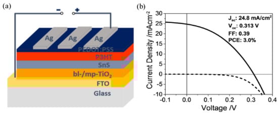 SnS has been used as a counter electrode (CE) in iodide/triiodide (I−/I3−)-based liquid junction dye-sensitised solar cells (DSSCs), as an alternative to expensive platinum (Pt). Chen et al. synthesised SnS nanosheets via the thermal decomposition of tin diethyldithiocarbamate and Na-DEDTC molecular precursors, with SnS applied as a CE in DSSCs. Excellent catalytic activity for triiodide reduction, resulting in a power conversion efficiency of 6.56%, is reported. Alam et al. [] reported stoichiometric SnS nanostructured films deposited using a continuous spray pyrolysis (CoSP) technique with an aqueous spray solution of tin chloride and thiourea, with the film used as a CE in DSSCs as a replacement for Pt []. DSSCs have attracted a significant degree of interest, however they suffer from encapsulation issues due to solvent leakage of the liquid-based electrolyte. Another third-generation solar cell technology, i.e., inorganic–organic hybrid solar cells, are adopted from DSSCs; in these systems, inorganic semiconductor materials are used as sensitizers and low bandgap polymers act as hole transport materials. Guo et al. have shown all solid state inorganic–organic heterojunction solar cells with the structure: FTO/TiO2/SnS/P3HT/Ag, where SnS was deposited using chemical bath deposition (CBD) as a sensitizer and P3HT working as both a hole transporter and electron donor. An efficiency of 2.8% was achieved, with a high VOC of 0.85 V obtained. Haque et al. [] have reported hybrid solar cells with ITO/TiO2/SnS/P3HT/MoO3/Ag architecture, where SnS was deposited by spin coating, using SnCl2 and thioacetamide (TAA) in pyridine as the tin and sulfur sources, respectively. The SnS layer was infiltrated with a P3HT solution left for 30 s on top of the SnS layer before spin coating. The device was completed via the thermal evaporation of MoO3 and Ag on top of the SnS/P3HT layers. An efficiency of 1.2% was obtained for solar cells produced via this preparation method []. In another study, Haque et al. have fabricated SnS thin film solar cells with glass/FTO/planar-TiO2/mp-TiO2/SnS/P3HT/PEDOT:PSS/Ag architecture that incorporated mesoporous TiO2/SnS/P3HT heterojunctions. The SnS layer was deposited using an environmentally friendly solution-based spin coating. The film morphology and surface coverage obtained could be tuned by modifying the precursor solution composition and deposition conditions. The PEDOT:PSS layer was inserted between P3HT layer and the Ag electrode to improve the VOC and JSC of the devices, which also enables efficient hole extraction while protecting the organic material during the metal contact evaporation. This leads to an increase in the power conversion efficiency from 2.6% to 3.0%. It is believed that highly efficient and more stable devices could be produced by further optimisation of the SnS film morphology, as well as through device engineering (Figure 4) [].