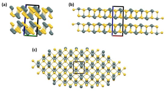 Bilayer SnS, views along; (a) the a-axis (zigzag direction); (b) the b-axis (zigzag direction); and (c) the c-axis. The orthorhombic unit cell (a = 3.98, b = 4.33, c = 11.18 Å; α = β = γ = 90°) is marked in all three cases [].