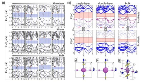 (I) Band structure of monochalcogenides at bulk, monolayer and bilayer []; (II) band structure of single layer, double layer and bulk SnS (a–c) with corresponding Brillouin zones (d–f) []. (I) Adapted with permission from Phys. Rev. B, 2015, 8, 085,406; (II) adapted with permission from J. Appl. Phys., 2013, 23, 233507.