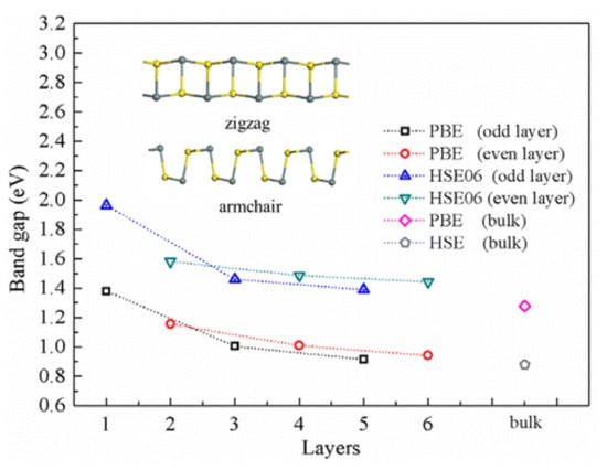 A theoretical study using first principle calculations with density functional theory (DFT) was conducted by Tritsaris et al. to determine the optoelectronic properties of single layer, double layer, and bulk SnS. It was found that the optoelectronic properties of SnS vary significantly with respect to the number of layers and the separation between them: the calculated band gaps were found to be 2.72 eV, 1.57 eV, and 1.07 eV for single layer, double layer, and bulk SnS, respectively, with values increasing with tensile strain along the layer stacking direction []. The minimum direct band gap was 2.72 eV, located at Γ (along the Γ–Y and Γ–Z directions the direct band gaps were 2.93 eV and 2.77 eV, respectively). These large band gaps suggest that single layer SnS is transparent for the longer wavelengths in the visible region of the electromagnetic spectrum. The electron effective masses were found to reduce as the number of layers increased from single to double layer to bulk. Tensile strain also increases electron effective mass for double layer and bulk SnS []. Figure 7 shows the odd–even quantum confinement effects for SnS at different layer thicknesses.