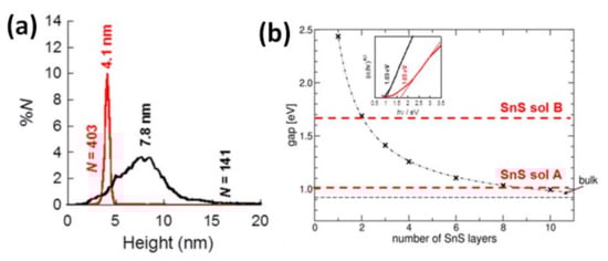 (a) Histograms of nanosheet thickness for nanosheets centrifuged at 180× g (black, 7.8 nm, ca. 10 layers average) and 11,620× g (red, 4.1 nm, ca. 2 layers average). (b) Calculated band gaps of SnS (from DFTB) at different layer thicknesses obtained compared with experimentally determined band gaps 180× g (SnS sol A) and 11,620× g (SnS sol B). Adapted with permission from J. Am. Chem. Soc. 2015, 39, 12689–12696.