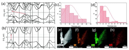 Lead (Pb)-doped SnS nanosheets with the formula Pb0.2Sn0.8S were synthesised by the dithiocarbamate melt reaction of [Pb(S2(Net2)2] with [Sn(S2(Net2)2nBu2] at 450 °C under argon, the products of which were then exfoliated using NMP and separated by centrifugation at 180× g and 11,620× g by Norton et al. HAADF STEM and EDX of nanosheets showed an even distribution of Sn, Pb and S across the crystalline flakes, suggesting successful alloying at the nanoscale. Before high-speed centrifugation, the nanosheets had a length of 134 ± 45 nm and a thickness of 10.9 ± 7.7 nm. The highly centrifuged sheets had a lateral size of the order of tens of nm with a thickness of 2.7 ± 1.7 nm (Figure 9) []. The nanosheets obtained had direct band gaps of 1.25 eV and 1.86 eV, respectively, as determined by UV–Vis spectroscopy, which is striking because it meant that the addition of lead changes the indirect band gap of 2D SnS to a direct band gap in (Pb,Sn)S. DFT calculations showed that this was a consequence of strain on the SnS lattice introduced by the Pb ions that altered the electronic band structure of the material. The latter is a significant result, because it showed that by simple alloying of an isovalent element an indirect to direct transition could be garnered in SnS, which is an important feature for a material to be used in thin film optoeletronic devices; it typically increases absorption of light because there is no requirement for an accompanying change in crystal momentum. Traditionally, in materials such as transition metal dichalcogenides, this indirect to direct transition had to be elicited by thinning the material to a true monolayer, which is extremely low-yielding for 2D materials produced by liquid-phase exfoliation, and too time-consuming to be produced in bulk from micromechanical exfoliation. The approach has yet to be reported in other IV–VI semiconductors.