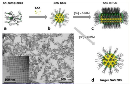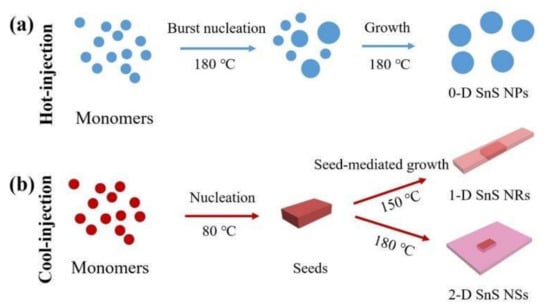 Hot injection synthesis methods are useful, because one can precisely control the size, shape, and composition by controlling synthesis conditions including reaction time and temperature, solvent, precursor types, and concentrations. The main parameters, which have to be controlled during nanocrystal synthesis, are size (emission colour), size dispersion (photoluminescence line width), and surface passivation (photoluminescence quantum yield, PLQY). Surface ligands play a very important role in tuning nanocrystal properties such as processability, reactivity, and stability. They also help to prevent nanocrystal agglomeration and facilitate the dispersion in a variety of solvents but deteriorate the performance of solar cells. Wu et al. have synthesised SnS nanocrystals of different dimensions (0D, 1D, and 2D) using a facile colloidal route and studied their photoelectrochemical performance. A hot-injection method was used to synthesise 0D SnS nanoparticles (NPs), whilst a temperature-controlled cool-injection method was used to fabricate 1D SnS nanorods (NRs) and 2D SnS NSs. It was found that the order of injection of 1-Dodecanethiol (DDT) and thioacetamide is crucial to control the dimension of SnS nanocrystals. In the cool-injected method, the pre-injected thioacetamide not only served as a S source to form SnS seeds, but also coordinates to the tin centre to form Sn(I18hioimidateate, favouring the anisotropic growth of SnS NRs and NSs (Figure 10) []. Biacchi et al. have reported the colloidal synthesis of different shaped SnS compounds, including nanosheets, and studied their photocatalytic degradation behaviour with methylene blue (MB). In-depth crystallographic analysis was performed on as-obtained SnS systems. For nanosheet synthesis, tin acetate, oleylamine, and sulfur were used with the reaction occurring in a three-necked flask at 180 °C. The nanosheets produced were of the order of 270 nm lateral size. Kubelka–Munck functions determined the SnS nanosheets to have an indirect and direct band gap of 1.1 eV and 1.3 eV, respectively [].