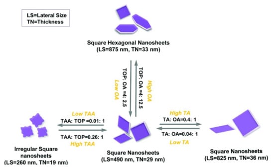 For the synthesis of square-like SnS nanosheets, TA was partly transformed to tin oleate. The synthesis of nanosheets begins with complexation of the tin precursor and OA followed by the synthesis of SnS nanocrystals via the reaction of Sn and S precursors; the growth step then occurs via the SnS nanocrystals. Lowering the amount of TA was found to form larger, thicker nanosheets due to the reduced number of nuclei formed. When TOP is added without OA, small, square nanosheets and nanoparticles are formed, indicating that TOP enhances the formation of (101) square facet nanosheets. Increasing the OA concentration was found to increase both the size and thickness. For the synthesis of hexagonal nanosheets, OA concentration must be above a certain threshold (2 mmol). The formation of large laterally sized, hexagonal nanosheets is due to the large absorption energy of OA ligands on (100) facets as opposed to (101) and (010) (Figure 12) [].