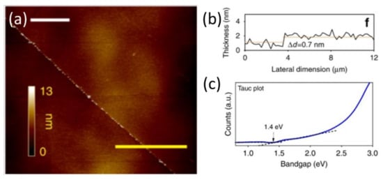 (a) Atomic force microscopy (AFM) image of synthesised SnS monolayer; (b) AFM profile of SnS nanosheet; and (c) Tauc plot of SnS produced. Adapted with permission from Nat. Commun. 2020, 1, 3449.