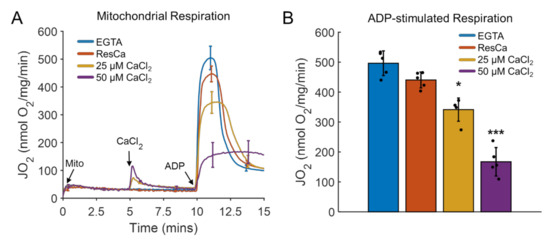 Oxidative phosphorylation decreasing proportionally with the calcium load. (A) Representative mitochondrial respiration profiles in the presence of the calcium chelator EGTA (~4 µM residual calcium (ResCa)) and after a 25 µM or 50 µM bolus of calcium. The mitochondrial calcium loads for these conditions were 0, 40, 250, and 500 nmol calcium/mg mitochondria, respectively. Mitochondria were energized with 5 mM sodium pyruvate and 1 mM L-malate. (B) The average maximum ADP-stimulated respiration rate decreased dramatically at higher calcium doses. Maximal ADP-stimulated respiration was induced following the addition of a 500 µM ADP bolus. Data are presented as the mean ± standard deviation for a sample size of five biological replicates. Here, a * and *** represent p values < 0.01 and <0.001, respectively.