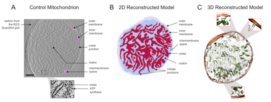 Cryo-Electron Microscopy (Cryo-EM) Sample Vitrification and Imaging. Isolated mitochondria were suspended at a concentration of 0.1 mg/mL in a 2 mL respiration buffer with 5 mM sodium pyruvate and 1 mM L-malate. At the collection times indicated, 5 µL samples were pipetted from the mitochondrial suspension and deposited on Quantifoil R2/2 holey carbon grids that were pretreated for 1 min using a Pelco EasiGlo glow discharge unit. Prior to the mitochondria addition, 5–10 μL of 10 nm nanogold markers were applied to the grids, which were then air dried. These beads provided markers for fiducial alignment of the tilt series. The grids were blotted to thin the water layer and subsequently plunged into liquid ethane at room temperature using a Vitrobot Mark IV with automated temperature regulation, blotting, and humidity control (Fisher Scientific). The Vitrobot chamber was set at 4 °C with 100% humidity, and the grids were blotted with a blot force of 1. The grids were then transferred and stored in liquid nitrogen until imaging. Tilt series were performed using an FEI Talos Arctica at 200 keV in low-dose conditions, operated using Thermofisher’s Tomography software. Images were collected in linear mode on a Falcon 3EC direct electron detector with an electron dose of ~2e−/A2 per tilt image. The images were collected at 22,000× magnification (4.7 A/pixel). The total electron dose was approximately 100 e−/Å2 for each tomogram.