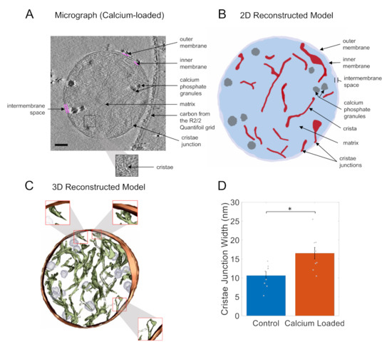 Calcium-loaded mitochondria with granules alters cristae structure. (A) Representative portion of a tomogram from a mitochondrion with calcium phosphate granules exposed to a 50 µM bolus of calcium at an approximate resolution of 4 Å. The solid magenta lines highlight the inner or outer membrane boundaries. (B) 2D reconstructed model showing that calcium phosphate granules disrupted the cristae membrane surface area, consisting of most of the enzymes responsible for oxidative phosphorylation. (C) 3D reconstructed model showing a densely packed, interconnected cristae network. (D) Cristae junction widths in calcium-loaded mitochondria, which were significantly larger than the control widths. Approximately 10 cristae junctions from each type of mitochondrion were selected at random and measured. The bars are plotted as means of the data, with error bars representing the standard error of the mean. A * signifies a p value less than 0.01. Gray dots are individual data points. Scale bar = 250 nm.