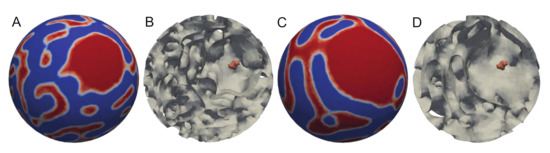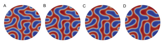 Therefore, long wavelength states with will be linearly unstable. Such a long wavelength instability is exploited by the nonlinear CH system. Short wavelength states with will decay in a linear fashion and convert short wavelength modes (i.e., large domains) into spatiotemporal patterns. The system regulates the exponential growth tendency of long wavelength modes caused by random noise and organizes them into spatially coherent states. Therefore, the spatiotemporal patterns of certain characteristic wavelengths are stabilized in the CH equation. Due to computational challenges, most simulations were carried out in rectangular domains. Motivated by the microscopic phase separation and pattern formation of the spherical and cylindrical molecular assembly, Guan et al. considered the Cahn–Hilliard equation in a circular domain [39]. In the circular domain geometry, certain symmetric patterns occurred frequently during the simulation. These authors found that the solution of the Cahn–Hilliard equation could be effectively analyzed with Fourier–Bessel modes [40]. In the current work, the finite element method (FEM) was considered due to its advantage in dealing with irregular domains. The Cahn–Hilliard equation is a fourth-order equation whose weak form would result from the presence of second-order spatial derivatives. Solving such a form with a standard Lagrange finite element basis is problematic. Therefore, Equation (1), with the boundary condition Equation (4), is reformulated as two coupled second-order equations: