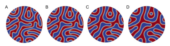 The mitochondrial morphology and the effects of calcium phosphate granules were simulated using the well-established CH model framework. The CH equation was first implemented in the situation of the absence of calcium. In Figure 4, four snapshots of the CH equation simulation are presented with a time step for Equations (14) and (15) on a circle domain with a radius of four (relative to the unit circle). The parameter is one for the transition region length, which is indicated by the white, rim-like features in Figure 4. The red domain of Figure 4 is the fluid matrix, while the blue domain is the inner membrane. It is shown that in the simulation, the cristae could be observed, and the inner membrane and the fluid matrix could be separated. In the absence of calcium, the inner membrane and the fluid matrix were initially randomly and uniformly distributed in the circle domain.