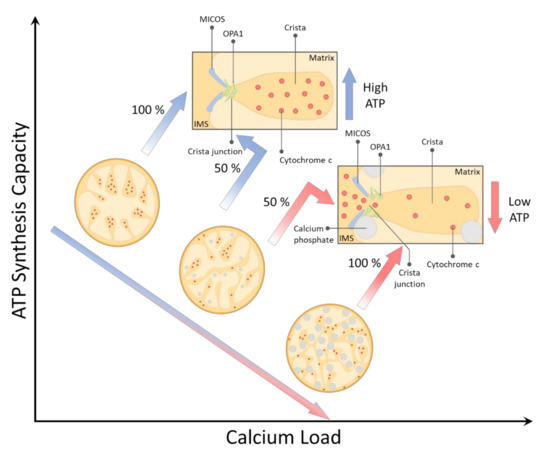 In the calcium-overloaded state, the mitochondrial ultrastructure was significantly altered, as is shown in Figure 3. The presence of calcium phosphate granules in the matrix space had a devastating effect on the intermembrane and cristae spaces. The matrix space was significantly expanded, with the intermembrane and cristae spaces being dramatically reduced. The matrix space expanded due to the increased osmotic pressure in the matrix that occurred when large amounts of calcium were taken up by the mitochondria. In addition, the cristae junctions were significantly wider, being about 17 nm when calcium phosphate granules were present in the matrix (Figure 3D). Based on this finding, we believe that this increase in the cristae junction width led to a redistribution of cytochrome c from the cristae lumen to the intermembrane space. A recent modeling study demonstrated that a small decrease in the cytochrome c concentration in the cristae lumen or an increase in the diffusion distance between complexes III and IV may result in a kinetic disadvantage and lower the maximum electron flux through the respiratory system [51].