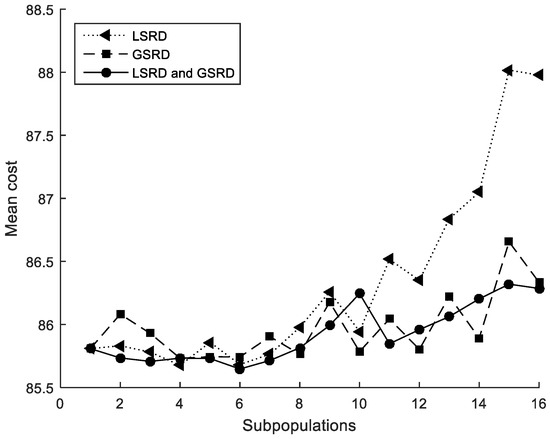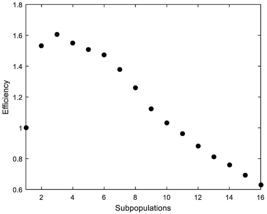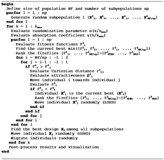 - The method achieves designs close to the global optimum despite the number of parallel processes considered. Small random displacements (LSRD and GSRD) have proven to be essential to avoiding the bias produced by the migration between subpopulations. LSRD shows its effect when there are few subpopulations of many individuals. In contrast, GSRD shows its effect when there are many subpopulations with few individuals. The combined use of LSRD and GSRD slightly improves the results and reduces their sensitivity in relation to the number of parallel processes considered. It should be noted that the proposed method was tested considering only up to 16 parallel processes (or 16 subpopulations). More research should be done considering more parallel processes. To facilitate this task for other potential researchers or for other uses, the authors included the MATLAB® code for the complete method in the Appendix A.