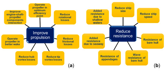 Hochkirch and Bertram [22] explained that there are several ways of decreasing the consumption of fuel by a vessel: reducing the required power for operation and propulsion; using fuel energy for propulsion and on-board equipment more efficiently; and using hybrid technologies for operation, combining fossil fuels with renewables, such as solar energy. According to [22], there are several factors to be considered to reduce the power required for propulsion, thus improving the performance of a ship. These can be classified into improving the propulsion system and reducing the boat’s hydrodynamic resistance, as shown in Figure 1. To improve ship propulsion (Figure 1a), the propeller must operate optimally. Propulsion losses due to rotation of the shaft and propeller must be reduced, as must friction loads between the water and the propulsor, as well as those caused by the generation of tip and hub vortices. The propeller must operate in optimal wake conditions. In addition, the efficiency of the interactions between the components of the engine-shaft-propeller system must be maximized to increase the transmission of power delivered from the engine to the propeller.