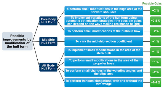 Possible gains in resistance reduction through permanent modifications of the hull, considering that the main dimensions of the vessel and the propeller diameter are unchanged. Modified from [32].