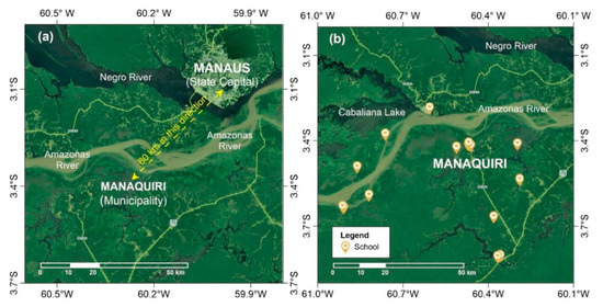 An example of a municipality in Amazonas State where river transport is necessary for education. (a) Location of Manaquiri municipality with respect to Manaus, the capital of Amazonas State. (b) Location of the main schools around Manaquiri. Adapted from Google Maps.