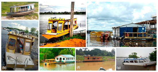 School transport in the state of Amazonas, Brazil. (a) An old boat used to transport children to school about ten years ago (Kleyphide Pereira da Silva 2020). (b) Front view of an Amazon school boat promoted by the government in Manaus, Amazonas (Luiz Henrique Moreira Sousa 2020). (c) Profile view of the Amazon school boat in Itacoatiara, Amazonas (Fernando V. Dias Balieiro 2013). (d) School boat station in the port of Manaus, Amazonas (Harlysson Maia and Francisco Xavier de Carvalho Neto 2020). (e) A school boat performing its daily activities in a remote community on the Amazon (modified from [57]). (f) A typical school in the municipality of Tapauá, Amazonas (Fernando V. Dias Balieiro 2013). (g) A typical boat used for transporting people between remote communities in the state (Fernando V. Dias Balieiro 2013).