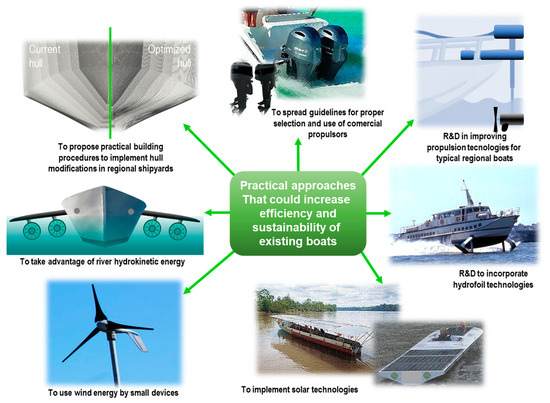 Possible improvements in the efficiency and sustainability of the existing boats used for daily activities in remote regions of the Amazon and similar regions elsewhere. Adapted image credits: commercial propulsors [89]; hydrofoil technologies [90]; solar technologies (left: [80], right: [83]); wind energy [91].