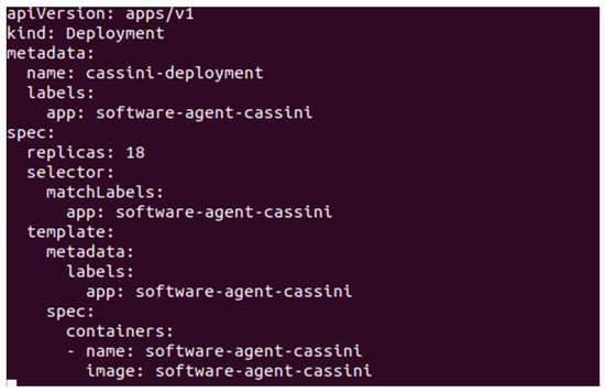 - Kubernetes configuration: following the structure presented in Figure 3 Kubernetes Cluster is installed in Linux, an Ubuntu distribution, and it is composed by one master and one worker node and one pod in this worker node. Agents’ creation and configuration are driven by the deploy.yaml file, see Figure 4, where it commands the deployment of the Docker containers. The service kubectl is the one to execute the deployment of the agents where results of such deployment are presented in the next section.