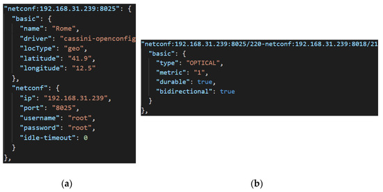 - Topology definition: the topology is defined in a JSON file so that it can be interpreted by ONOS. Seven metrics can be set “Devices”, “links”, “hosts”, “Apps”, “ports”, “regions” and “layouts”. In this work we only use the objects “device” and “link”. Each device object is linked to each container previously deployed by indicating some specific fields, such as IP of the container and port to enable NETCONF connectivity, ONOS driver or map location, as can be seen in the exemplary definition if Figure 5a. Moreover, the links define the interconnection between two agents by setting their IP and ports, type of connection or bidirectionality, among others as depicted in Figure 5b.