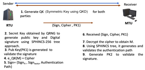 To address the research questions in Set 1, we developed an algorithm that includes the following three phases: key generation, encryption and authentication. We have used the B92 protocol for key generation and encryption, and SPHINCS-256 for integrity and authentication. Moreover, to address the research questions in Set 2, we have modified the SPHINCS-256 algorithm. The SPHINCS-256 algorithm has four main components, namely, PRNG based on Chacha-12 algorithm for HORST secret-key generation and expansion, hashing in WOTS and HORS public-key generation, hashing in trees, Chacha Permutation used in trees. Furthermore, the sender transmits a combination of signature, message, and SPHINCS-256 public key to the receiver. In our proposed algorithm, we use the quantum random number generator (QRNG), instead of pseudo random number generator (PRNG), to generate a truly random HORST secret key. Instead of the message, the sender sends the cipher along with signature and public key to the receiver. Figure 1 provides a brief overview of the steps in our proposed scheme.