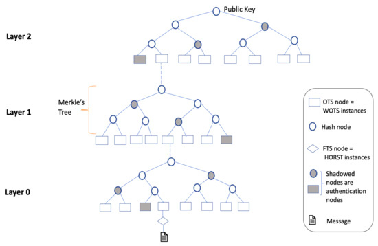 The main disadvantages of the one-time signature schemes (OTS) are (i) large public key size and (ii) the need for a new public key generation for each message. The Merkle-Signature Scheme (MSS) addresses the flaw of OTS by generating one public key to sign more than one message. The number of messages should be a power of 2 such that M = . It generates the public and private keys such that is within 1 ≤ i ≤ 2n and hash function is = H(). It creates a hash tree with leaf level i = 0 and the root level i = n [31].