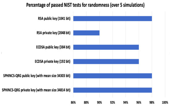 We performed 15 statistical analysis on five random numbers for each algorithm. Thus, we performed 15 × 5 = 75 tests. Out of 75 tests, Chacha-12 passed 70 tests and, QRNG passed all of them. Figure 21 exhibits a graph that shows Chacha-12 PRNG scored 93.3%, and QRNG scored 100% for successfully passing the tests. The Chacha-12 algorithm is feasible for resource-constrained devices [61]. However, Datcu et al. [57], showed that secure PRNG Chacha does not pass all the statistical tests of Monte-Carlo analysis. Moreover, ID Quantique has developed a QRNG chip for critical infrastructure involving the Internet of Things (IoT) and other resource constrained devices [19]. Table 9 provides a synthesis of results obtained from comparative analysis of the proposed algorithm, RSA, ECDSA and SPHINCS-256.