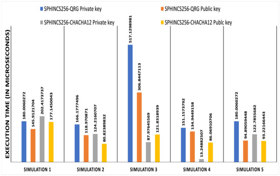 Moreover, we also performed a comparative analysis based on theoretical performance. Since SPHINCS is a h/d-ary certification tree, Daniel et al. [13] provided a rough theoretical run time values based on the count of pseudo random number functions (PRFs), PRNG and, hashes. The total height of hyper tree is h with d multiple layers of trees. It takes d OTS key generations, d + 2 PRF calls, d + 1 PRNG calls and 2t + d(( l (w +1)) ) hashes. HORST uses parameter t, such that t = . The height of the HORST tree is τ = log t. WOTS uses a signature size and runtime tradeoff parameter w such that w∈. However, the time complexity of RSA is O() and that of ECC is O()) [58]. Further, all pseudo-random number generator requires O(n) bit operations. In contrast, QRNG based on Hadamard transformation can be computed in O(nlogn) operations in classical hardware and, in O(1) in quantum hardware [59,60]. Therefore, we conclude that theoretically, the computational complexity of our proposed algorithm is higher than that of existing SPHINCS based on PRNG and AGA-12.