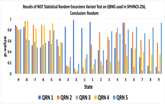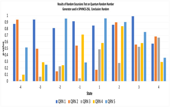 To test the randomness of the quantum random number generator (QRNG), we used all 15 tests of the NIST statistical test suite and, the QRNG passed all of them in every simulation. Thus, we conclude that QRNG is truly random. Table 7 displays the p-values of random number generated by QRNG used in SPHINCS-256. As the p-values ≥ 0.01, the NIST tool concludes the sequence to be random with a confidence of 99%. Figure 17 and Figure 18 display the results of Random Excursions Test and Random Excursions Variant Test, respectively for SPHINCS-QRNG. The Random Excursions test executes sub-tests on each of the following states; , +1, +2, +3 and +4, to check the frequency of visits to a cumulative sums state within a cycle of a random walk matches with that one would expect for random sequence [55]. For a certain state, if the p-value ≥ 0.01, the sequence is random. For example, in Figure 17, the p-value of QRN 1 with state +1 is approximately 0.8492. Thus, the sequence at state +1 is random.