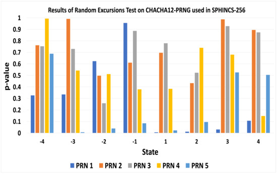 Results of Random Excursions Test on Chacha-12 PRNG used in SPHINCS-256.