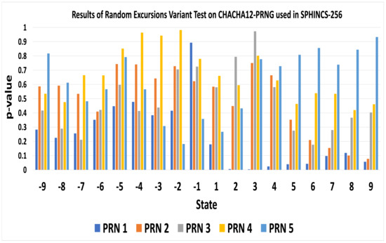 The Random Excursions Variant test verifies whether the number of visits to a particular state in a cumulative sum random walk deviates from the expected number of visits in the random walk. It considers 18 states consisting of { …, +8, +9} and, if the p-value of a particular state is greater than or equal to 0.01, that means the sequence is random. However, when we ran all 15 tests on a random number generated by SPHINCS-Chacha12, it does not pass 100% of the NIST statistical tests. The pseudo-random number, PRN 5, generated by Chacha-12, failed the Maurer’s Universal Statistical test. Also, PRN 1 and PRN 5 does not pass the Random Excursions Test and Random Excursions Variant Test with all states. Table 8, Figure 19 and Figure 20 exhibit the results of the randomness of Chacha-12 PRNG tested by NIST statistical test suite.