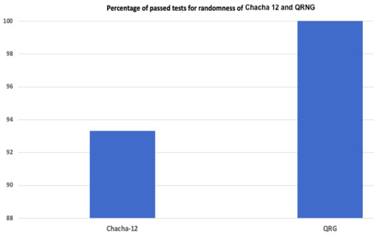 Percentage of passed tests for randomness scored by Chacha-12 and QRNG.