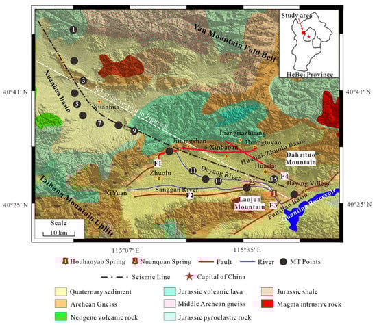 The Huailai Basin is a Cenozoic fault basin, controlled by NW extensional tectonic stress. The basement consists of pre-Sinian schist and Archean gneiss [23]. The thickness of the sedimentary caprock above the basement can reach 2 km [13]. Inside the basin, the main exposed stratum is the Quaternary sedimentary layer; outside the basin, a larger amount of Archean gneiss, Jurassic volcanic lava, and pyroclastic rock is exposed, and a small amount of intrusive rocks is interspersed, which reflects the regional tectonic and magmatic activity. There are four main faults in the basin, which are closely related to the formation of the geothermal system. The fault (F1) on the northern margin of Huaizhuo basin originates from Xiyuan, through Jimingshan and Xinbaoan, and ends near Huangtuyao. It is a normal fault that controls sedimentation activity in the Huailai Basin [24]. The Sanggan River hidden fault (F2) is distributed along the Sanggan River valley in the east–west direction and stops near the Nuanquan hot spring [25], and its activity is not obvious [26]. The northern margin fault of the Fanshan Basin (F3) runs along the southern margin of Laojun Mountain, passes through Guanting Reservoir and Dahaituo Mountain, and ends near Yanhuangbai Temple. It is an active fault with an outcropping on the surface [27]. The Xinbaoan–Shacheng fault (F4) starts near Liangjiazhuang and extends southeast through the Xinbaoan before heading north to Huailai and stops near the Baying Village in the northwest of the Guanting Reservoir, where it intersects with the faults of the northern margin of the Fanshan Basin [28]. Near the faults (particularly at the intersection of different faults), due to rock fragmentation and pinnate fissures, the groundwater has suitable transport conditions and has formed abundant geothermal resources, such as the Houhaoyao hot field and the Nuanquan hot spring (Figure 1).