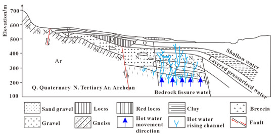 The geothermal system can be divided into three aquifers in bedrock and the overlying strata in the Huailai area. (1) The Tertiary fractured pore-confined aquifer in bedrock, which is composed of Archean gneiss and its upper coarse gravel, giant gravel. This aquifer has a low water content but has formed a good water and thermal storage layer, where structural fissures are strongly developed. The temperature of this aquifer is high. (2) The Quaternary pore confined aquifer is mainly formed by loose sediment such as coarse sand and gravel, which has good water and heat storage capacity. Above the aquifer, fine silt, sticky sand, and clay are found, which all have good water and heat insulation properties. (3) The Quaternary pore phreatic aquifer is mainly composed of river–lake sediments (such as medium-fine sand, silt, and clay) and has a large thickness [8]. The upper part is mainly composed of sand and clay, with calcium bonding and gypsum, forming a sufficient cap layer [2] (Figure 2). In general, the Huailai area has a large water and heat storage capacity. According to the drilling data in this area, the temperature of the hot spring water is generally between 25 and 80 °C, with the potential for temperatures over 80 °C. The temperature of the Quaternary phreatic hot water is 25–55 °C, and the temperature of the pressurized hot water in the Quaternary loose sediment is 60–80 °C. The temperature of the bedrock fissure water can reach about 120 °C, and the ratio of cold water mixing is up to 0.7 [1].