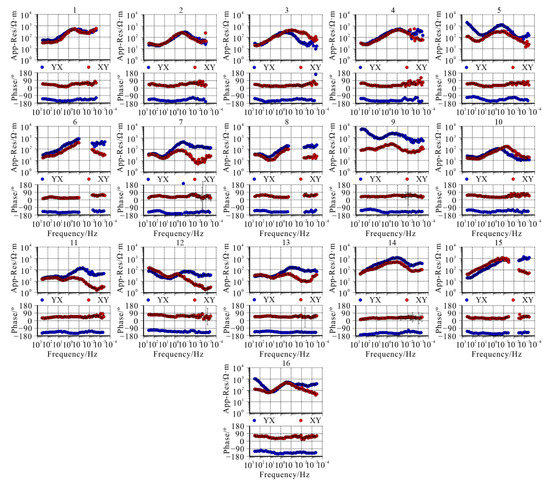 SSMT200 software, provided by Phoenix, was used for data processing. First, the original time series was transformed from the time domain to the frequency domain by Fourier transform. Then, robust estimation was used to obtain apparent resistivity, phase, and impedance [30]. After processing, the apparent resistivity and phase curves of all measuring points were obtained, which showed the underground electrical characteristics. Figure 3 shows the apparent resistivity and phase curves of all measuring points in the study area. Overall, the study area has low resistivity, with typical basin resistivity characteristics. In terms of the shape of the curve, the resistivity is lower in the frequency range higher than 1 Hz, which may be related to the sedimentary caprock of the basin. In the 1–0.01 Hz range, it has relatively high resistivity, showing that the crust of the study area has high resistance, which is related to the crystalline basement of the basin. It has a low resistivity in the frequency range below 0.01 Hz, showing that the deep part of the basin has lower resistivity.
