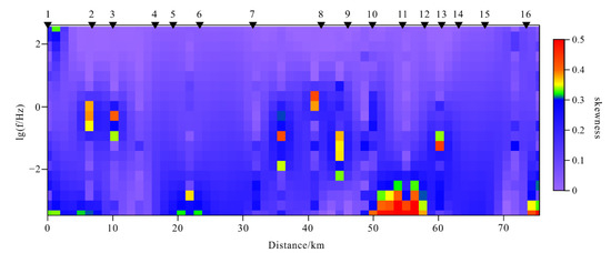 Dimensionality analysis provides an important basis for determining the inversion method (1D/2D/3D). The two-dimensional inversion must ensure that the study area has an obvious two-dimensional structure. The skewness is an important parameter reflecting the dimension of the electrical structure of the underground medium. The phase tensor is not affected by electric field distortion [31] and has a unique advantage in judging the dimensionality of the area. In this study, the phase tensor decomposition was used to analyze the regional dimensionality. Figure 4 shows the skewness of the study area. At present, it is generally accepted that when the skewness is less than 0.3, the underground structure can be approximated as a two-dimensional structure; when the skewness is greater than 0.3, a three-dimensional nature of the underground structure is more likely. The calculation results showed that the overall skewness degree is <0.3; only the local skewness degree is >0.3. As a result, we found that the underground structure of the study area has obvious two-dimensional features. This provided the basis of the 2D inversion work in this study.